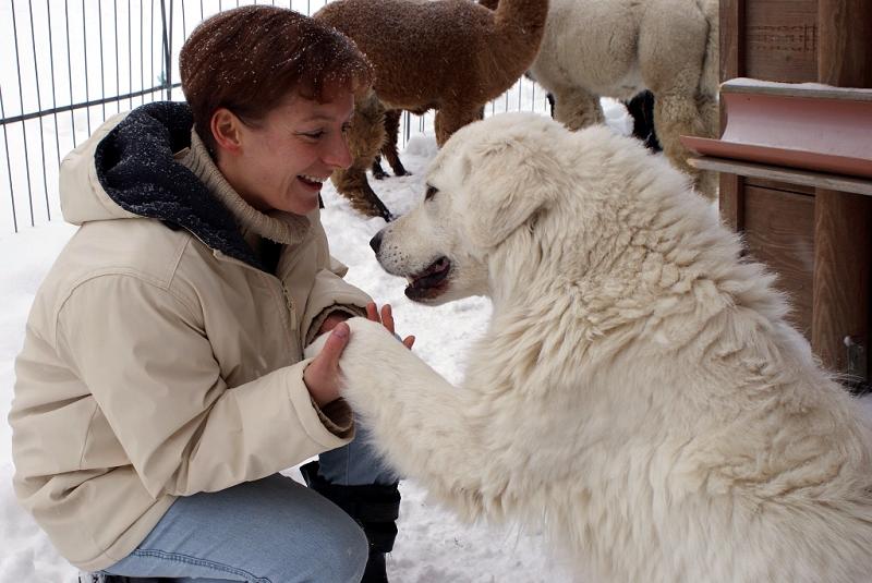 Daheim angekommen durfte sie als erstes den Hof begutachten. Nachdem sie alles erkundet hatte, haben wir sie unseren Alpakas vorgestellt. Durch einen Zaun voneinander getrennt haben sich nun alle neugierig bestaunt und beschnüffelt. Donna zeigte nur wenig Scheu. Die Alpakas waren größtenteils weiß, hatten Wolle und dufteten nach Heu… das muss sie irgendwie an zu Hause erinnert haben. Nur die großen Tiere hatten ein bisschen Angst vor dem kleinen quirligen Bündel! Wir ließen Hund und Alpakas nun etwa 2 Wochen Zeit sich durch den Zaun kennenzulernen. Danach durfte sie ihr Lager im Stall beziehen und mit ihrer Arbeit beginnen. Alle Bewohner gewöhnten sich sehr schnell aneinander, denn jeder merkte dass vom anderen keine Gefahr ausgeht.